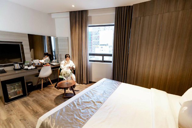 Phòng Deluxe 24m2 có cửa sổ hướng thành phố.