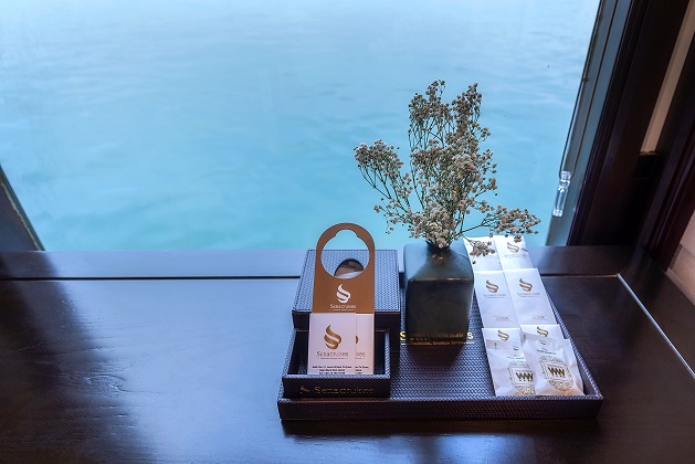 - Thức uống và trái cây chào mừng khi lên tàu
