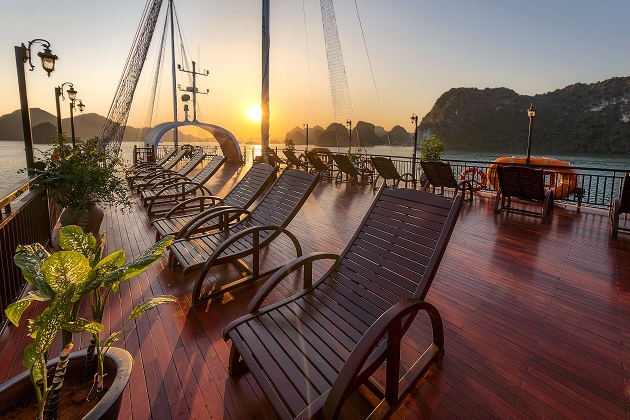 Thử tưởng tượng buổi sáng các bạn thức dậy, đứng trên sân thượng của du thuyền, xung quanh là khung cảnh bình minh tuyệt đẹp trên vịnh, rồi hít 1 hơi thật sâu bầu không khí trong lành và kết hợp uyển chuyển với những động tác Taichi – Thái Cực Quyền. Cảm giác cơ thể như được tái tạo lại năng lượng sau những chuỗi ngày dài làm việc mệt mỏi hay thư giãn với một tách trà, cà phê hay một ly đồ uống ở bất cứ nơi nào bạn thích trên tàu và ngắm nhìn những cảnh đẹp nối tiếp nhau không dứt trên Vịnh.