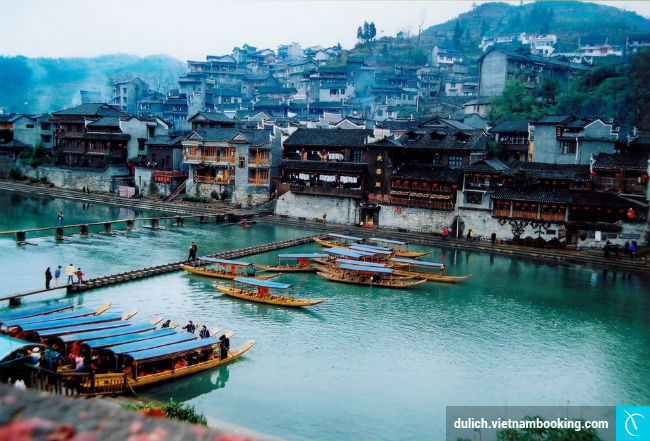Phượng Hoàng cổ trấn là thị trấn cổ nằm bên dòng sông Đà Giang, tỉnh Hồ Nam. Nơi đây là địa danh tiếng tăm thường xuất hiện trên phim truyền hình cổ trang. Cổ trấn này được xây dựng từ cách đây hơn 1,000 năm, với những ngôi nhà cổ áp sát vào núi và soi mình xuống Đà Giang khiến người ta liên tưởng đến bức tranh sơn thủy hữu tình. Đó là lý do bất cứ du khách nào cũng muốn đặt tour du lịch giá rẻ ghé thăm một lần.