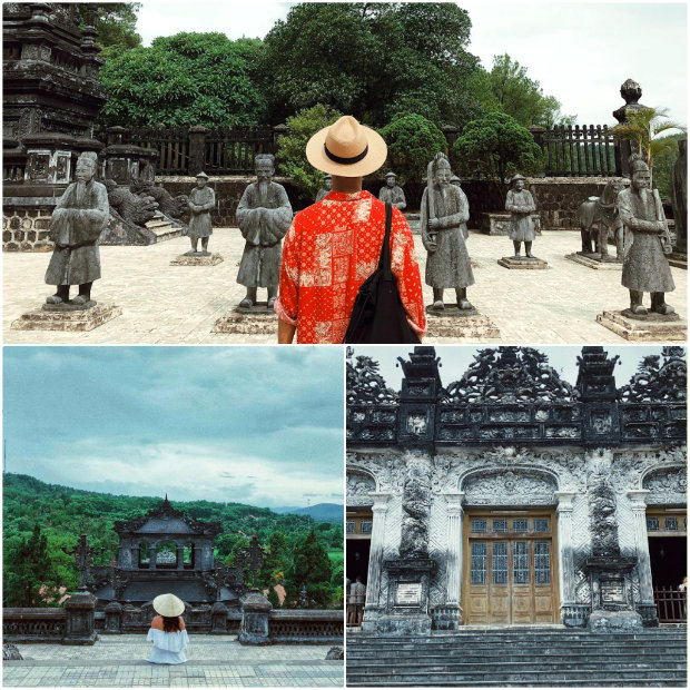Theo mình lăng Khải Định vẫn là đáng đi hơn cả vì ở đây rộng rãi, có nhiều công trình độc đáo và đặc biệt còn thoáng mát nữa. Với khách đi lẻ thì lăng Khải Định có giá 100.000Đ/người, bạn có thể tham quan, chụp ảnh các kiểu thoải mái. Một điều ấn tượng nhất khi đến với lăng Khải Định đó chính là những bức tượng tái hiện cảnh các vị quan triều Nguyễn với những gương mặt nghiêm nghị, đăm chiêu. Không gian trầm mặc, tĩnh lặng nơi đây chắc chắn sẽ làm cho bạn có một chút suy niệm về quá khứ của dân tộc.
