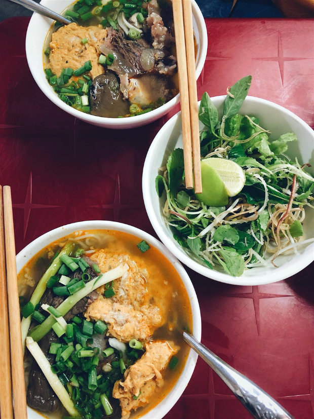 Chia tay với chùa Thiên Mụ, bạn chắc chắn không thể nào để bụng đói meo mà tiếp tục đi chơi, một món đặc sản Huế là cần thiết nhất ngay lúc này. Bún bò Huế, cơm hến, bánh bèo, bánh bột lọc… là những món ngon nhất ở Huế mà bạn nhất định phải thử qua. Và nhớ, nếu không phải là một “fan cứng” của ớt bạn hãy nhớ dặn người bán đừng cho thêm ớt, vì hầu hết người Huế đều ăn cay và dĩ nhiên những món ăn mà họ bán cũng cay dữ lắm. Đi dạo một vòng và ghé qua vài quán ăn ở Huế thì mình cũng hiểu vì sao nhiều người yêu thích ẩm thực Huế đến vậy. Đó là những món ăn vô cùng bình dị nhưng lại đậm đà, đặc trưng mà giá cả thì vô cùng rẻ.