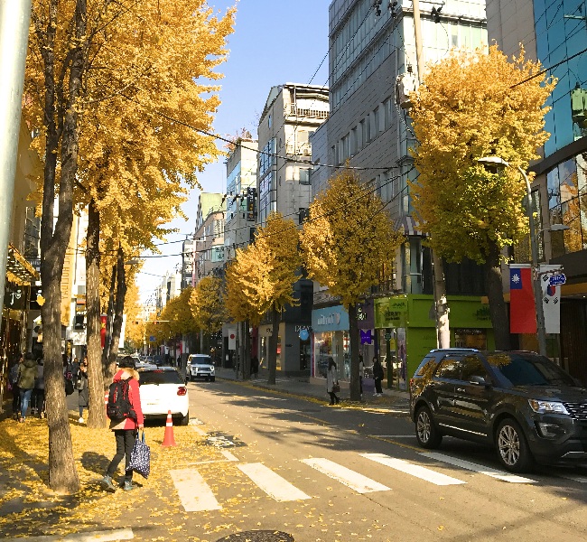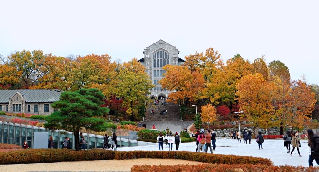 Trường đại học nữ Ewha ( Bạn có thể đi line 2 tàu điện ngầm để đến) trong khuôn viên trường và cả con đường dẫn vào trường đều rực sắc vàng, đỏ của lá thu. Nguồn ảnh: Internet