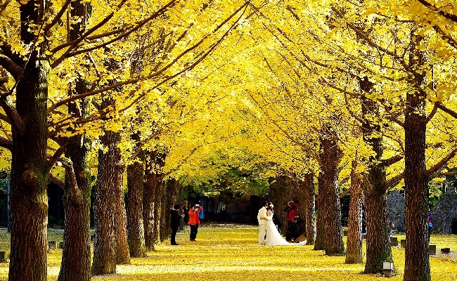 Đảo Nami – Chuncheon, cách Seoul 90 phút đi tàu điện ngầm, đảo Nami không quá xa lạ mỗi khi nhắc đến Hàn Quốc. Hình ảnh hàng cây ngân hạnh lâu năm thẳng tắp vàng rực vào thu là điểm thu hút nhất của nơi đây. Nguồn ảnh: Internet
