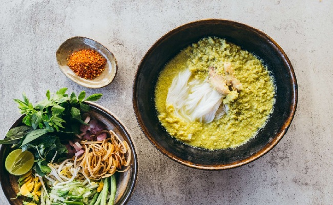 Nom banh chok có thể gọi đơn giản là món mỳ Khmer. Mỳ được nấu với cà ri xanh, cá, nghệ và chanh. Lá bạc hà tươi, đậu đũa, dưa chuột, hoa chuối và một số loại rau thơm khác dùng để ăn kèm với nom banh chok. Nguồn ảnh: Internet