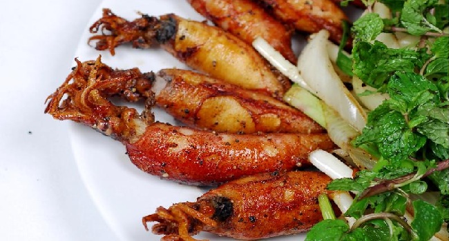 Ở các vùng biển như Sihanoukville và Kép, có nhiều gánh hàng rong bán hải sản với những chú mực trứng nướng vàng. Mực được tẩm nước chanh và mắm, sau đó xiên vào que tre và nướng trên than củi. Nguồn ảnh: Internet