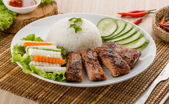 Bai sach chrouk (cơm thịt heo nướng) là một trong những món phổ biến nhất tại quốc gia này, tuy nhiên hương vị thì không tầm thường chút nào. Thịt heo cắt thành miếng được nướng qua than hồng. Người ta ướp thịt heo với nước cốt dừa và tỏi, khiến cho bai sach chrouk mang hương vị đậm đà riêng biệt. Ăn kèm với thịt nướng là cơm, dưa chuột, củ cải, gừng và một bát canh thơm lừng nữa. Nguồn ảnh: Internet