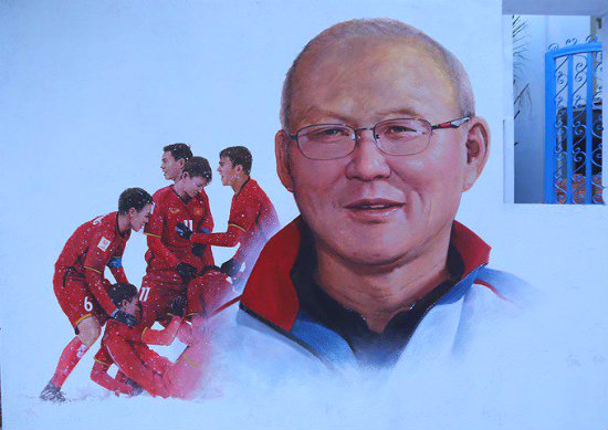 Đặc biệt, lần này các họa sĩ Hàn Quốc còn dành riêng một bức tranh về thầy trò đội tuyển U23 Việt Nam - niềm tự hào của bóng đá nước nhà. Và đó chính là một tình huống ăn mừng trong trận đấu lịch sử với Uzbekistan.