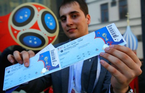 Một người đàn ông khoe vé xem đá bóng mua tại điểm bán của FIFA tại Moskva ngày 1/5. Ảnh: Sergei Karpukhin/Reuters