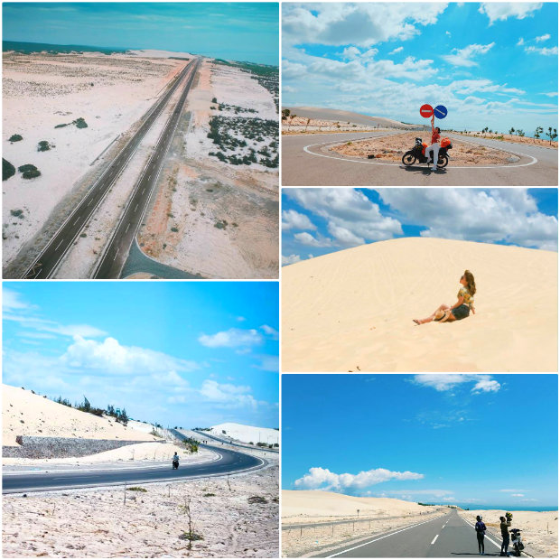 Phượt Bình Thuận bằng xe máy, đi qua cung đường ven biển là một trong những trải nghiệm đáng nhớ nhất của nhiều bạn trẻ. Một khung cảnh hoang sơ, một bên là đồi núi, đồi cát một bên là biển đúng là một cảnh đẹp ấn tượng.