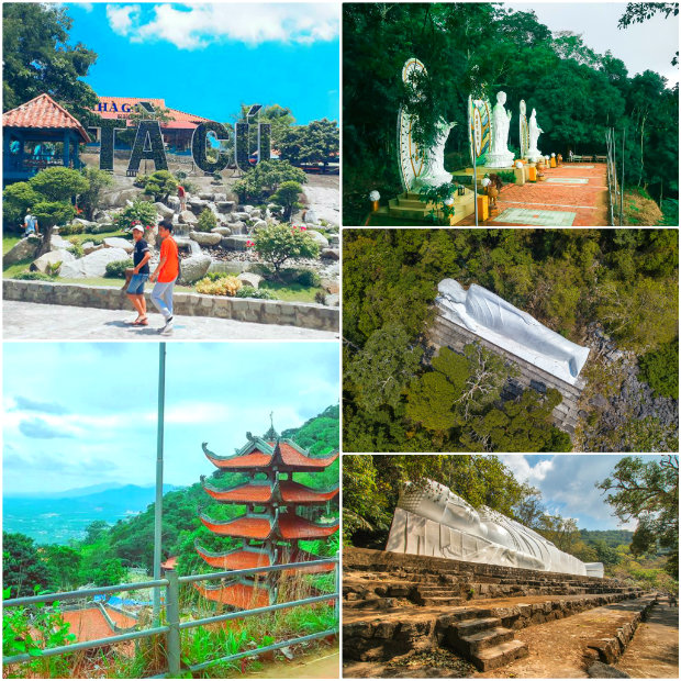 Ngôi chùa trên núi Tà Cú chính là điểm hấp dẫn du khách đến tham quan, viếng chùa. Tượng Phật nằm trên núi, dài 49m là tượng Phật nằm lớn nhất Đông Nam Á. Nếu là người mê leo núi, bạn có thể vượt qua 1000 bậc thang để lên đỉnh núi hoặc có thể chọn việc di chuyển bằng cáp treo (90.000Đ/người/khứ hồi).