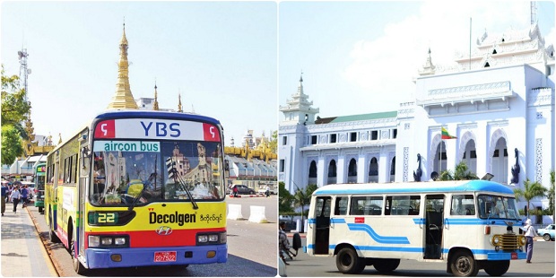Xe buýt: Myanmar đã cấm xe máy chạy trong nội thành hơn 10 năm nay, đó là lý do xe buýt công cộng ở đây lúc nào cũng quá tải. Đa số xe ôtô đang chạy trên đường ở Myanmar đều được sản xuất từ những năm 1950 - 1960 nhập khẩu từ Nhật, vì vậy trông chúng rất cũ kỹ, không có điều hòa, không cửa kính là bình thường.