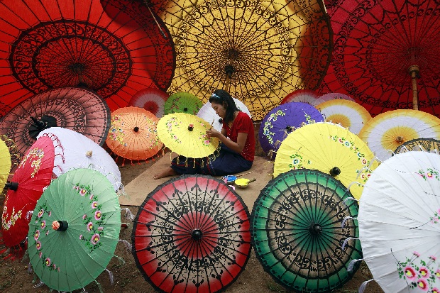Ô Pathein: Được làm bằng tay rất kỳ công với nguyên liệu từ vải cotton hoặc satin và gỗ với hoa văn vẽ tay, bạn có thể tìm thấy ô Pathein ở Bagan, Yanggon đều có với mức giá khoảng 1.000 kyat. Nguồn ảnh: Internet