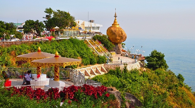 Golden Rock (chùa Kyaikhtiyo): Cách thành phố Yangon đến 210km, thuộc quận Thaton, bang Mon, chùa Hòn Đá Vàng được coi là một trong những thắng cảnh đáng viếng thăm nhất Myanmar. Hòn đá nằm trái với quy luật tự nhiên vẫn đứng vững trên cao chênh vênh suốt hàng ngàn năm, cư dân địa phương xem như một điềm linh thiêng nên dát vàng toàn bộ hòn đá cao 7,3 m này. Để lên thăm chùa Hòn Đá Vàng khá vất vả, bạn phải đi xe chuyên dụng rồi đi bộ hoặc ngồi kiệu 4 người khiêng.