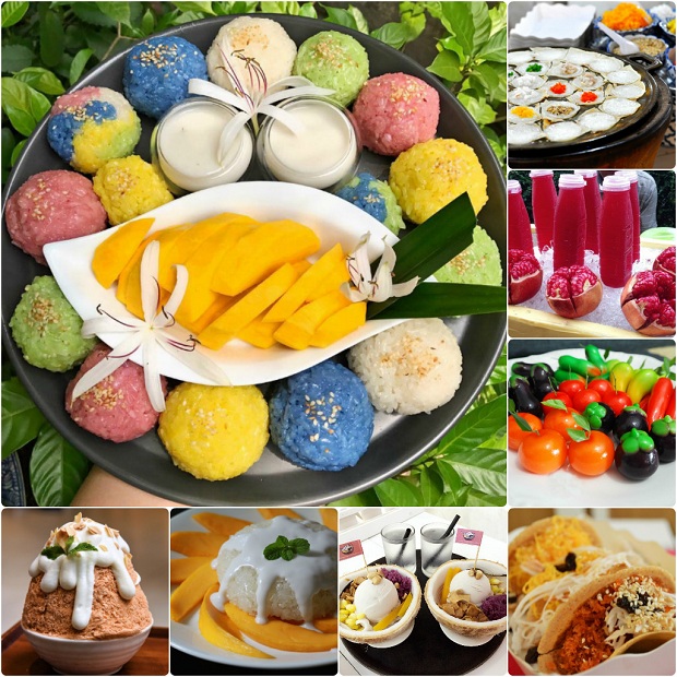 1001 món dessert và thức uống: Thật vậy, với lợi thế dồi dào trái cây nhiệt đới quanh năm,Thái Lan luôn khiến du khách quyến luyến những món tráng miệng và nước uống cực đẹp mắt và ngon miệng, giá cả lại không đắt đỏ như bingsu, cake ở quán After You - Dessert café ngon nhất thế giới, bánh crepe dừa (Khanom Buang), bánh đậu xanh (luk chup), bánh bò Thái (khanom Krok), bánh rô ti Thái, xôi xoài, nước lựu, trà sữa…..Bạn dễ dàng tìm thấy chúng ở bất kỳ quầy ẩm thực nào ở phố Tây Khaosan, food court trung tâm thương mại hay khu chợ địa phương của Thái.