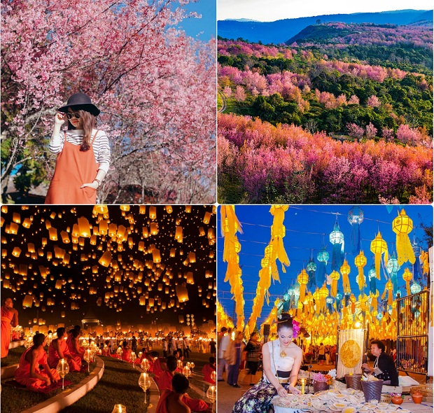 Mùa lễ hội đặc sắc: Chiang Mai nổi tiếng với hai lễ hội Hoa mai anh đào vào mùa xuân và lễ hội Hoa đăng Yee Peng vào cuối năm. Khung cảnh lễ hội ở Chiang Mai thực sự rất đáng để du khách trải nghiệm, đẹp không thốt nên lời đấy ạ.