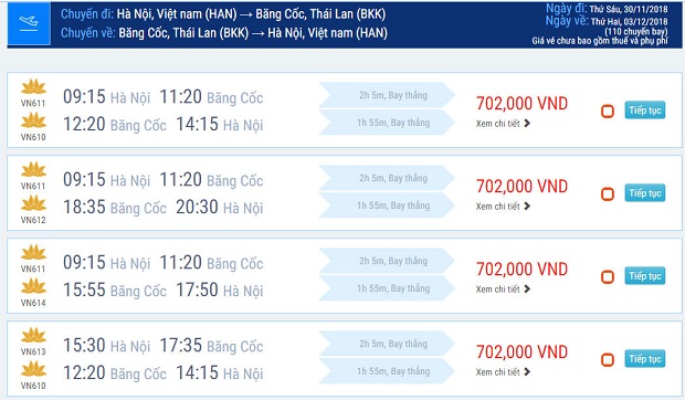 Tham khảo bảng giá vé máy bay đi Thái Lan (Vé chưa bao gồm thuế & phí)