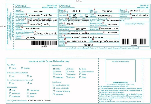 Cùng nằm trong khối ASEAN, Thái Lan miễn visa cho công dân Việt Nam nhập cảnh và lưu trú lại dưới 15 ngày. Vậy nên bạn an tâm vi vu Thái Lan mà không ngại thủ tục rườm rà. Tuy nhiên đối với bạn nào chưa xuất ngoại lần nào, để được nhập cảnh thuận lợi hãy chú ý: Trên máy bay từ Việt Nam đến Thái Lan, hãy nhận tờ khai nhập cảnh từ tiếp viên và điền thật đầy đủ thông tin theo hướng dẫn như hình bên dưới (nhớ chuẩn bị bút).