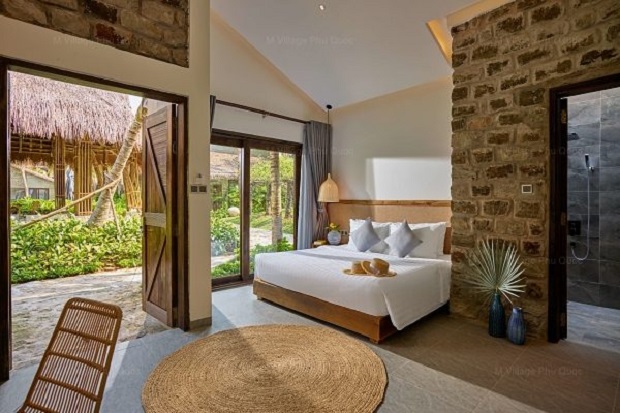 Phong cách đồng quê tại khách sạn Phú Quốc view đẹp M Village Phú Quốc mang hơi mộc mạc, gần gũi nhưng lần này còn có cả thiết kế châu u những năm 90. Xung quanh khu nghỉ dưỡng là hàng cây xanh mát,. Lợi thế đó giúp du khách tận hưởng không khí trong lành và cảm giác yên bình trong kỳ nghỉ.