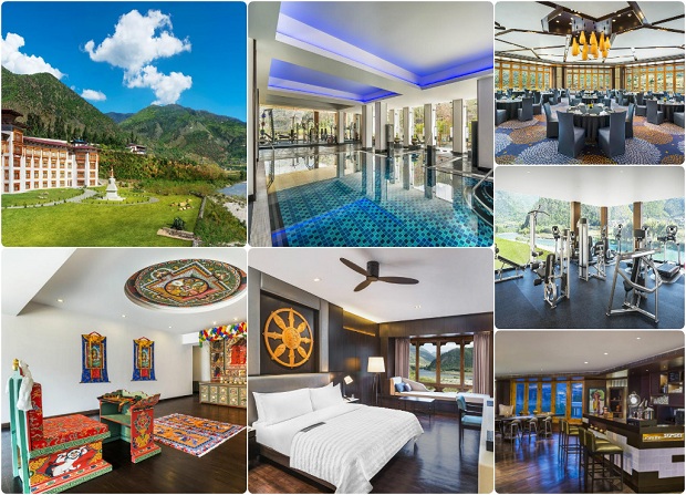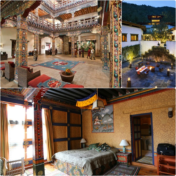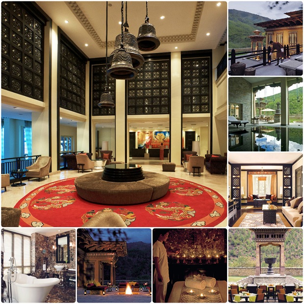 Đừng nghĩ Bhutan chắc chẳng có khách sạn 5 sao, khách sạn chuẩn 5 sao của Bhutan khiến bạn đi từ ngạc nhiên này đến bất ngờ khác đấy. Là tổng hòa của văn hóa Tây Tạng và phong cách phương Tây sang trọng, nổi bật phải kể đến: