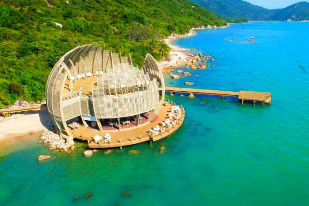 Nhà hàng ốp gỗ nổi bật như một đóa sen nở rộ giữa trung tâm An Lam Retreats Ninh Van Bay. - Ảnh: Internet.