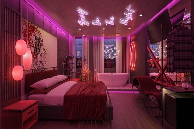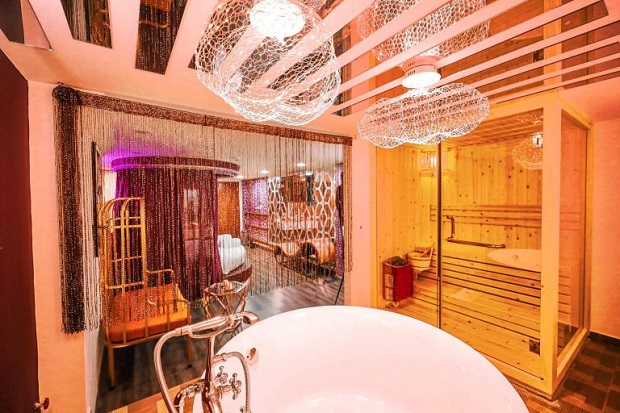 Ngoài ra, chiếc bồn tắm được trang bị ngay trong phòng nghỉ phía trên là vô vàng những bóng đèn vàng nhỏ nhắn. Kết hợp với màu đỏ của các trang bị nội thất, tất cả đều góp phần khiến cho không gian thêm phần lãng mạn pha chút huyền bí. Bạn và người ấy cũng có thể khám phá những trải nghiệm mới mẻ trong cuộc vui đầy thú vị.