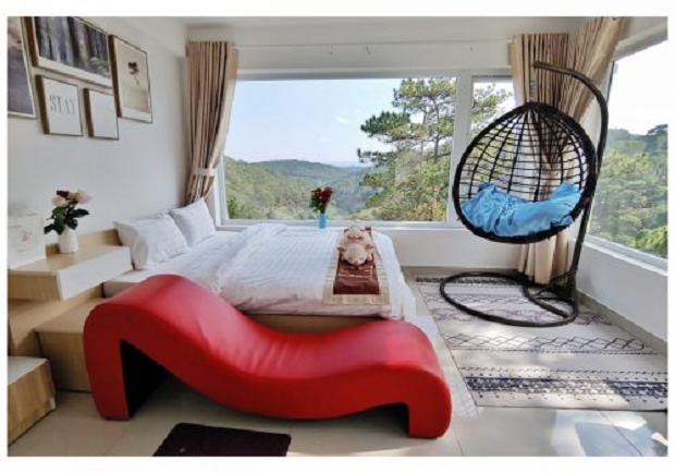 Căn phòng đầy đủ tiện nghi sang trọng được ôm lấy bởi những rừng thông xanh rì chạy dài thẳng tắp với muôn hoa đang độ xuân thì khoe sắc nghiêng mình bên mặt nước trong veo của hồ Tuyền Lâm đã tạo thêm nét ngoạn ngục và huyền bí cho không gian nghỉ dưỡng. Với lối thiết kế như những ngôi làng Âu Châu tin rằng sẽ mang đến những trải nghiệm vô cùng lý thú. Đây xứng đáng là một khách sạn dành cho các cặp tình nhân muốn trải nghiệm sự lãng mạn của tình yêu.