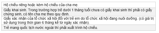 Hộ chiếu phải còn hiệu lực ít nhất 06 tháng tính từ ngày nhập cảnh vào quốc gia đó. Trong trường hợp trẻ em không có hộ chiếu riêng thì họ tên, ngày tháng năm sinh và ảnh của trẻ sẽ được ghi và dán vào hộ chiếu của người đại diện theo pháp luật, bao gồm cha mẹ đẻ, cha mẹ nuôi hoặc người giám hộ.