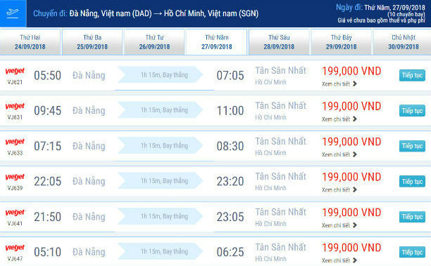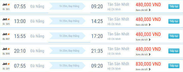 Lịch bay từ Đà Nẵng đi Sài Gòn của Vietnam Airlines, Vietjet Air, Jetstar