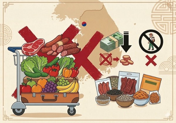 Hàn Quốc có quy định cực kỳ nghiêm ngặt về kiểm dịch nông lâm thủy sản. Bạn tuyệt đối không được mang theo các loại thực phẩm tươi sống, các sản phẩm từ thịt (xúc xích, giò chả, thịt khô, chà bông), rau củ quả tươi và các loại hạt. Nếu bị phát hiện mang theo những vật phẩm này mà không khai báo, bạn có thể bị phạt tiền rất nặng (từ 5 triệu Won trở lên) và bị cấm nhập cảnh vĩnh viễn.