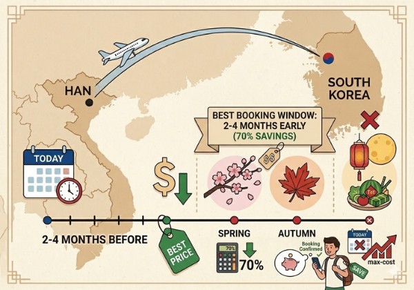 Thời điểm đặt vé quyết định đến 70% giá tiền bạn phải trả. Thông thường, bạn nên đặt vé trước ngày khởi hành từ 2 đến 4 tháng. Nếu bạn dự định đi vào mùa cao điểm như mùa hoa anh đào (cuối tháng 3, đầu tháng 4) hoặc mùa lá đỏ (tháng 10, 11), việc đặt vé muộn có thể khiến giá tăng gấp đôi hoặc thậm chí cháy vé. Tránh đặt vé vào các dịp lễ lớn của cả hai nước như Tết Nguyên Đán, lễ Chuseok (Trung thu Hàn Quốc) để tiết kiệm chi phí.