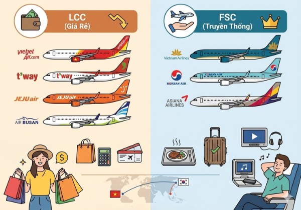 Hãng hàng không giá rẻ: Vietjet Air, T'way Air, Jeju Air, Air Busan. Đây là lựa chọn tối ưu cho những du khách muốn tiết kiệm chi phí để dành ngân sách cho việc mua sắm và vui chơi.