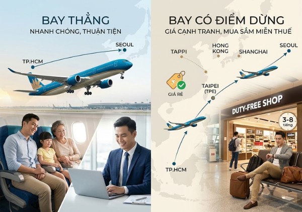 Bay có điểm dừng: Nếu bạn không quá gấp gáp về thời gian, các chuyến bay quá cảnh tại Đài Bắc (Eva Air, China Airlines), Hồng Kông (Cathay Pacific) hoặc Thượng Hải (China Southern Airlines) đôi khi sẽ có mức giá cực kỳ cạnh tranh. Thời gian quá cảnh thường kéo dài từ 3 đến 8 tiếng, bạn có thể tranh thủ mua sắm tại các cửa hàng miễn thuế ở sân bay trung chuyển.