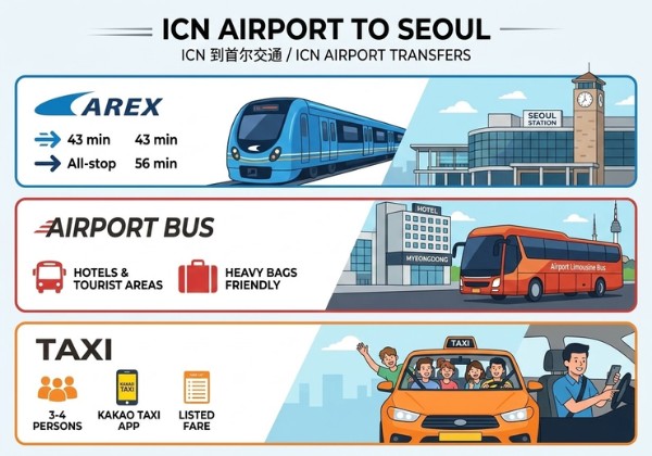 Tàu AREX: Có hai loại là Express Train (đi thẳng về ga Seoul trong 43 phút) và All-stop Train (dừng tại các ga trung gian, mất khoảng 56 phút).