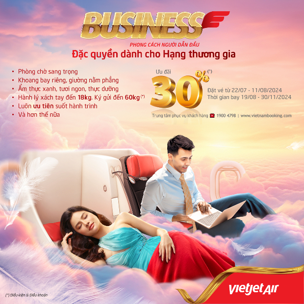 Từ nay đến hết 11/08/2024, hành khách sẽ được giảm 30% giá vé khi chọn hạng vé Thương gia Business Vietjet Air. AirlineRatings là tổ chức uy tín về đánh giá an toàn và chất lượng dịch vụ hàng không. Tổ chức đã vinh danh Vietjet trong hai hạng mục quan trọng của hàng không quốc tế là “Hãng hàng không siêu tiết kiệm tốt nhất thế giới” năm 2024 (Best Ultra Low-Cost Airline 2024) và “Hãng hàng không chi phí thấp có dịch vụ trên tàu bay tốt nhất năm 2024” (World’s Best Low-Cost Airline Onboard Hospitality 2024). Điều này, nhằm thể hiện sự đánh giá cao đối với các sản phẩm và dịch vụ của Vietjet.