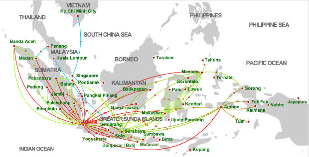 Từ 2 sân bay quốc tế lớn là Tân Sơn Nhất (Tp.HCM) và Nội Bài (Hà Nội), hành khách có thể đến thủ đô Jakarta, Indonesia bằng các đường bay liên doanh quá cảnh tại Kuala Lumpur của hãng Lion Air. Tại Jakarta, bạn có thể di chuyển đến tất cả các điểm đến nội địa của Indonesia cũng như điểm đến quốc tế tại một vài quốc gia như: Bali, Surabaya, Medan, Yogyakarta, Bangkok, Chiang Mai, Kuala Lumpur, Hong Kong, Singapore, Mumbai, New Delhi, Melbourne, Colombo,…