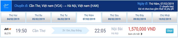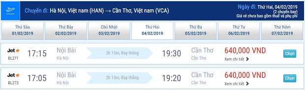 - Hà Nội < = > Cần Thơ: từ ngày 05/02/2019 – 10/02/2019.