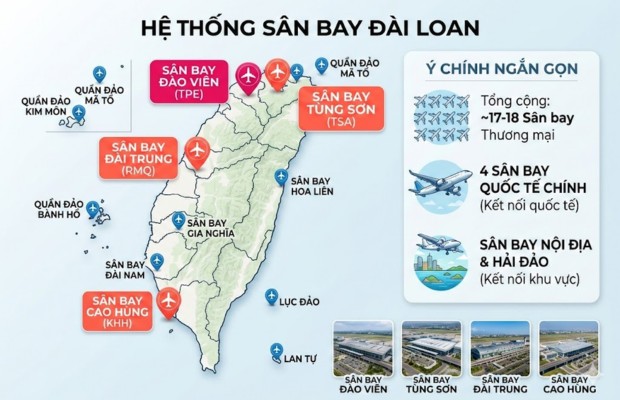 Hiện nay, hệ thống giao thông hàng không tại Đài Loan cực kỳ phát triển để đáp ứng nhu cầu du lịch và giao thương tăng vọt. Vậy thực tế Đài Loan có bao nhiêu sân bay? Theo số liệu cập nhật mới nhất, vùng lãnh thổ này hiện vận hành khoảng 17 - 18 sân bay thương mại (tính cả các sân bay trên hải đảo và sân bay hỗn hợp quân sự - dân dụng).