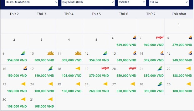 - Giá vé máy bay đi Quy Nhơn tháng 5 hạng vé phổ thông, đã bao gồm thuế, phí.