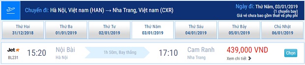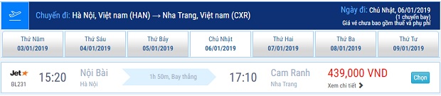 Vé máy bay đi Nha Trang của Jetstar thấp nhất từ 439,000 – 2,065,000 đồng/người/chiều. Giá vé thay đổi giữa các ngày trong tháng và càng gần cuối tháng, giá vé tăng càng cao.