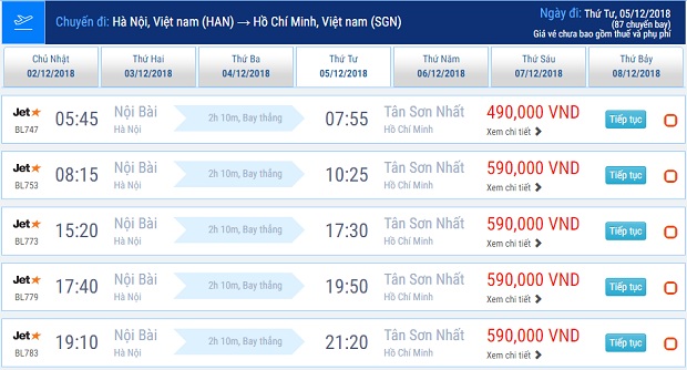 Giá vé đi Sài Gòn của Jetstar Pacific tháng 12/2018