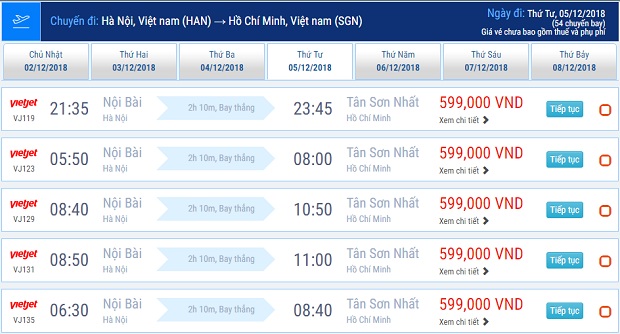 Giá vé đi Sài Gòn của Vietjet Air tháng 12/2018