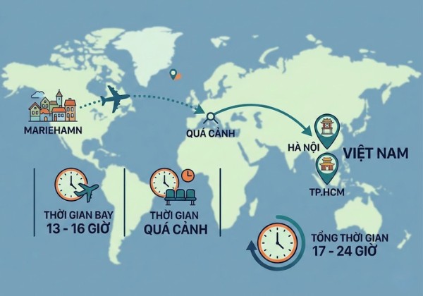 Tổng thời gian hành trình (bao gồm cả quá cảnh): Thông thường, tổng thời gian từ khi cất cánh ở Mariehamn (MHQ) đến khi hạ cánh ở Hà Nội (HAN) hoặc TP. HCM (SGN) là khoảng 17 đến 24 giờ . Con số này có thể dài hơn nếu lịch trình nối chuyến kéo dài