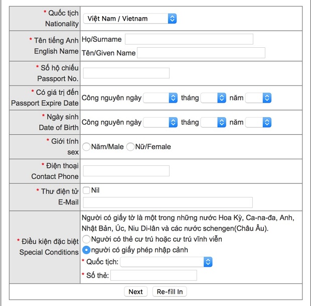 ♦ Mục điều kiện đặc biệt, chọn quốc gia mà bạn từng nhập cảnh.