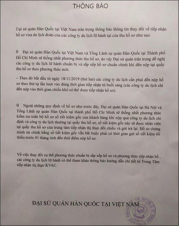 Theo thông tin trên, kể từ ngày 18/11/2019, Đại sứ quán Hàn Quốc tại Hà Nội và Tổng lãnh sự quán Hàn Quốc tại TP.HCM sẽ cùng thống nhất trong phương thức kiểm tra toàn bộ hồ sơ, nhất là sổ tiết kiệm gốc của khách hàng khi họ chứng minh tài chính và nộp qua công ty du lịch chỉ định cũng như các công ty du lịch thông thường tại quầy tiếp nhận hồ sơ - trung tâm thị thực KVAC.
